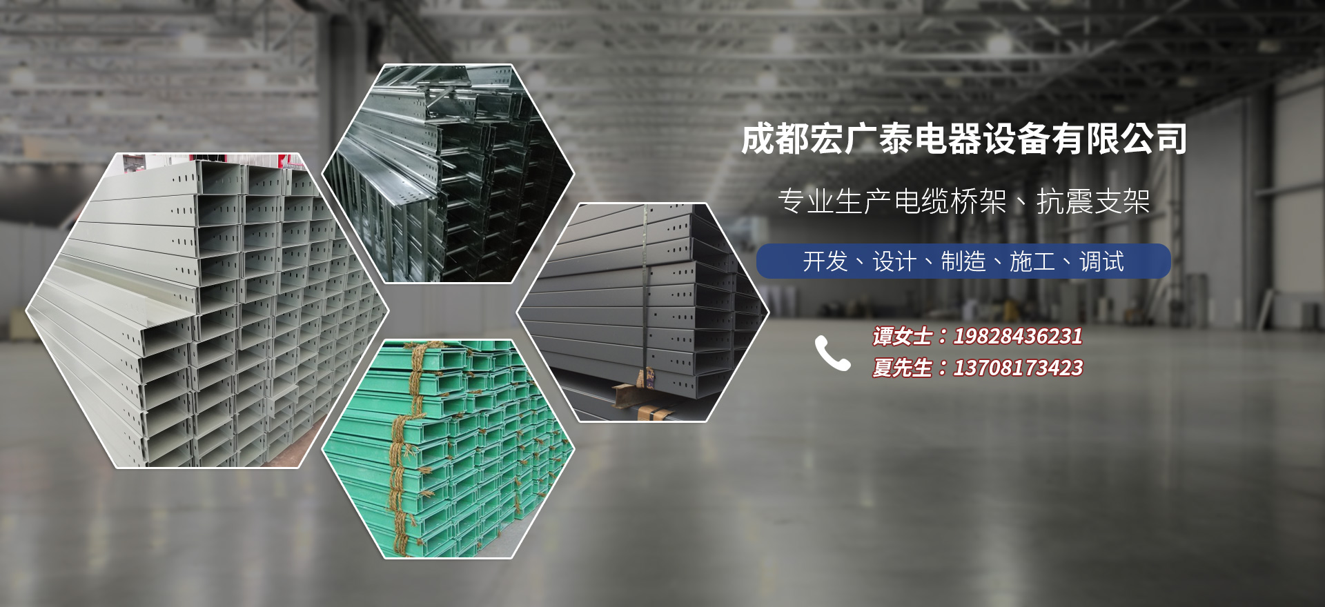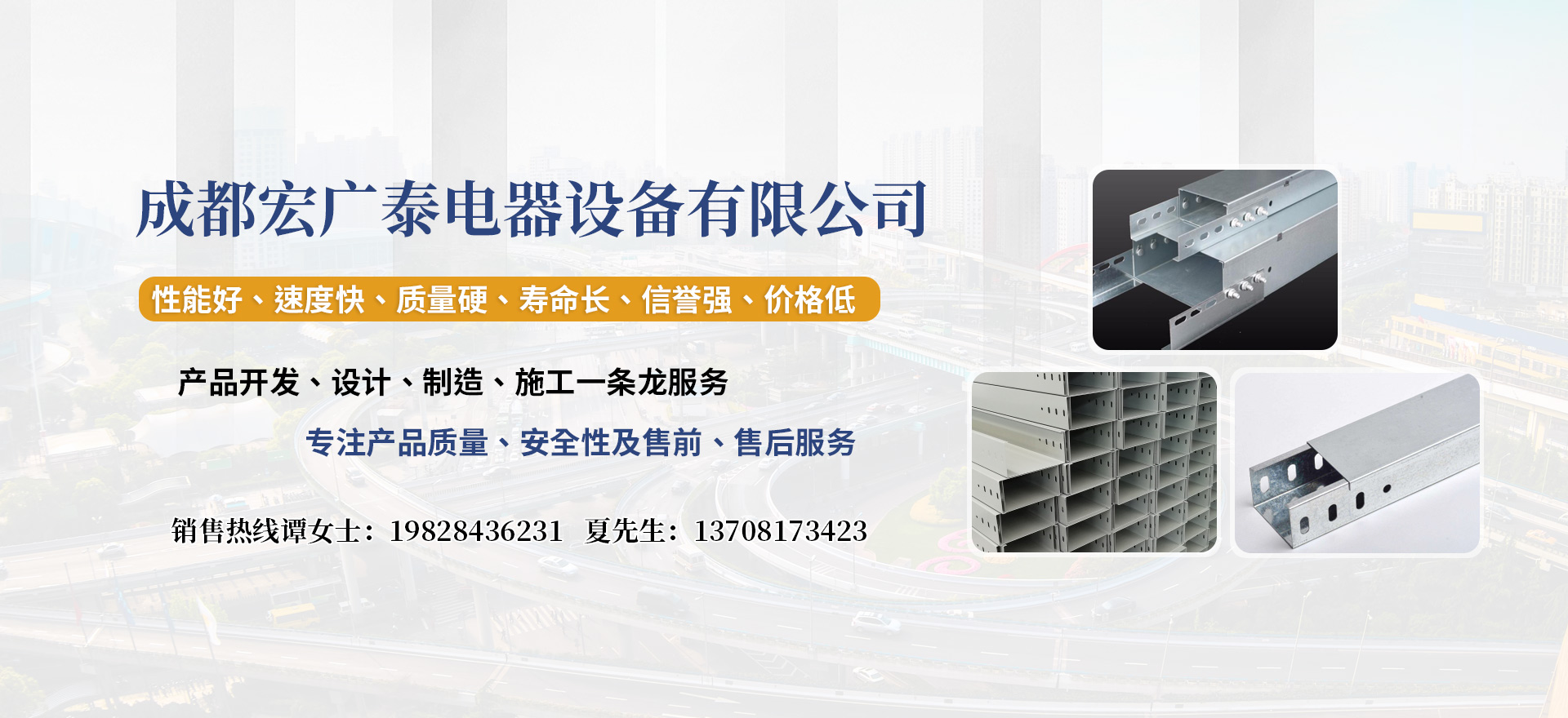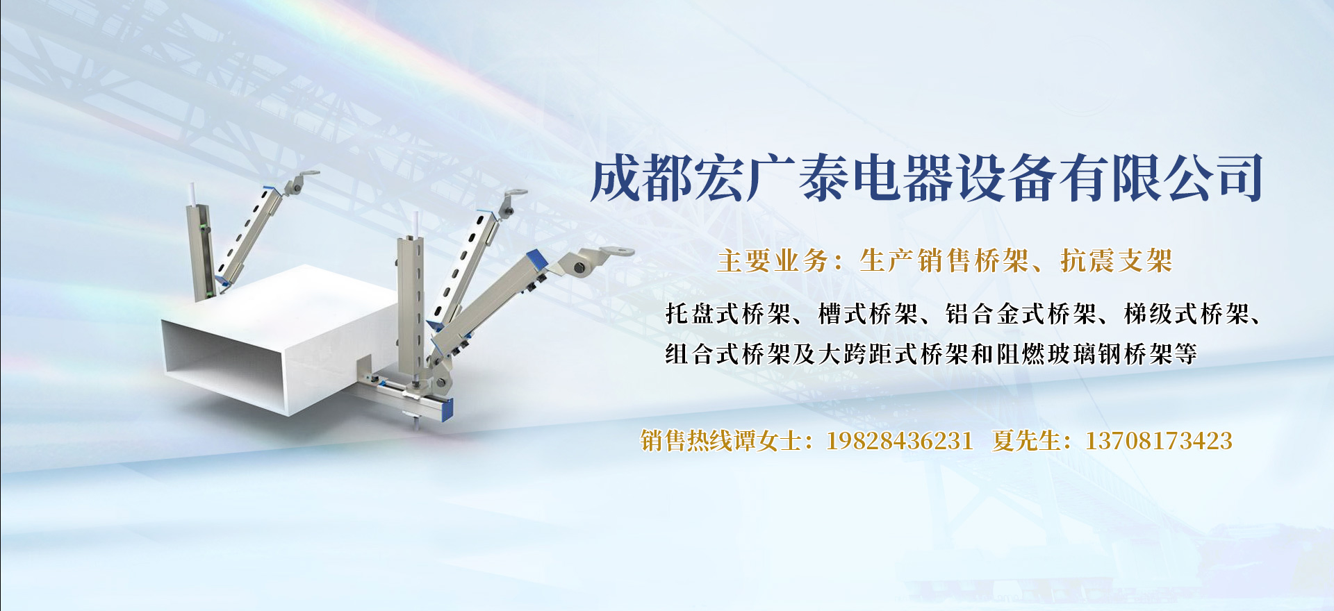 成都宏廣泰電器設備有限公司,是一家專業生產電纜橋架的公司,我公司電纜橋架選用優質冷板、優質鋼板‘采用鞍鋼、寶鋼材質的廠家,作為長期合格的供應商,表面處理分為噴漆、電鍍鋅、熱鍍鋅、靜電噴塑等,本公司產品廣泛運用于化工、紡織、電力、機械汽車、電子、國防、大樓建筑等場合,公司產品能滿足不同用戶,不同場合的要求,也可根據特殊行業要求訂購加工。